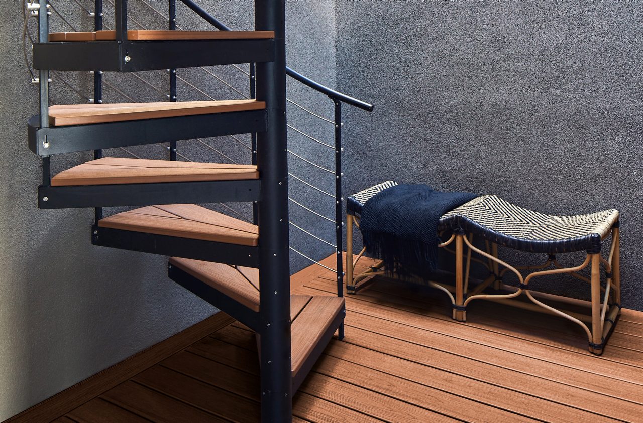The railing pairs brilliantly with a sleek spiral staircase from the Trex® Spiral Stairs™ collection. Connecting a first-floor space to a private rooftop deck that gives way to 360-degree views, this spiral staircase features the collection’s Multi-Line railing system. Riser Lights from the Trex® Outdoor Lighting™ collection were used on the spiral staircase to make for safe wayfinding.